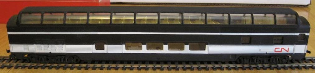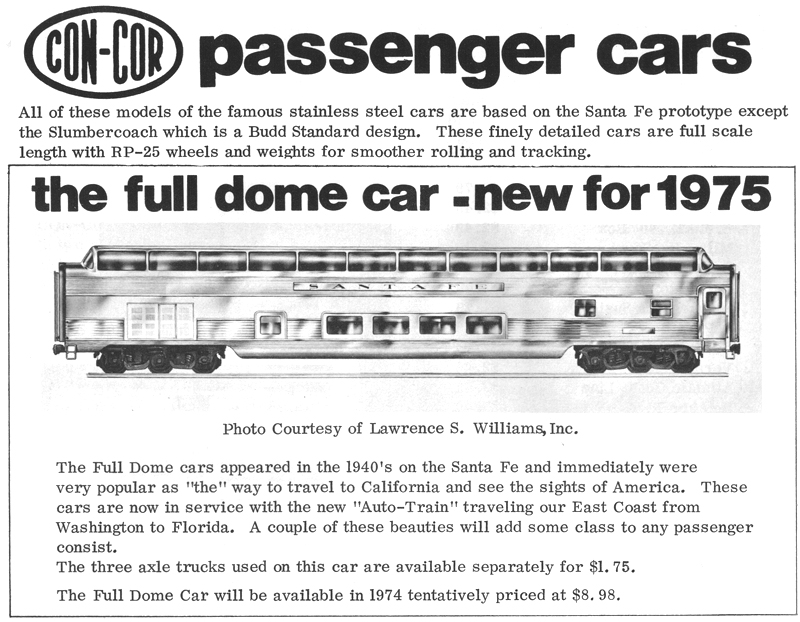 Con-Cor announced an HO-scale full dome passenger car for 1975 delivery. The car would have been the same prototype used by Bachmann’s example that delivered around this same mid-’70s date. Con-Cor’s model never materialized. You may click on the image above to view a larger version of this announcement.