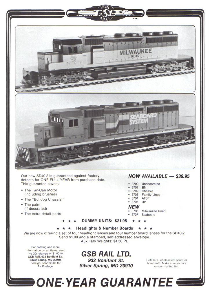 Remember GSB’s HO-scale SD40-2 from the early 1980s?  What about GSB’s Alco RS-1 or GSB’s EMD GP40-2?  Or how about the Gas Electric or 10-Pack Fuel Foilers?  Don’t remember them?  You’re not alone.  After an impressive catalog, some detail parts, and the SD40-2, GSB Rail Ltd. slowly disappeared.